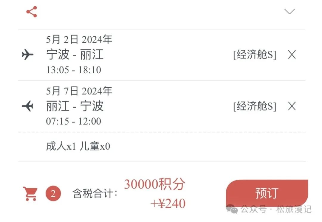 图:宁波祥鹤航空=丽江往返经济舱30k里程