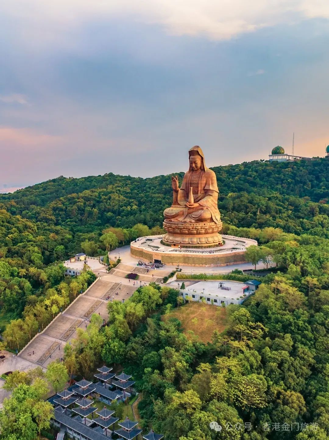 进入景区后,可以选择乘坐观光车或者步行,首先可以参观南海观音,这是一尊高61.9米的铜制观音像,寓意观世音菩萨于六月十九日诞生,位于西樵山大仙峰顶,她端坐在莲台上,观世音菩萨,普度众生,救苦救难,是西樵山的标志性景观之一。