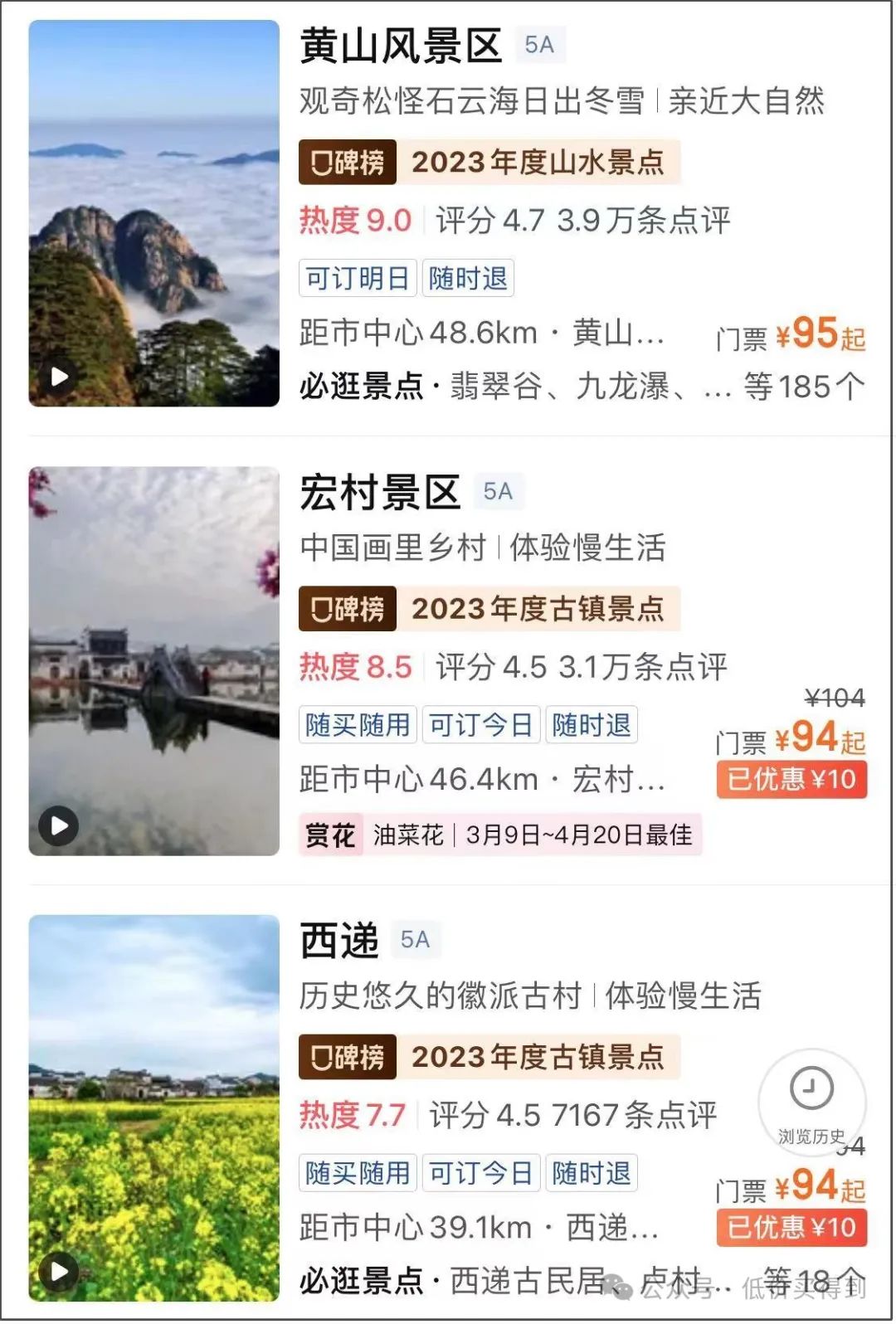 据实测,黄山市内几大热门景点的门票价格在OTA上至少都在94元起,如果能拿到免费票或者半价票还是很划算的。