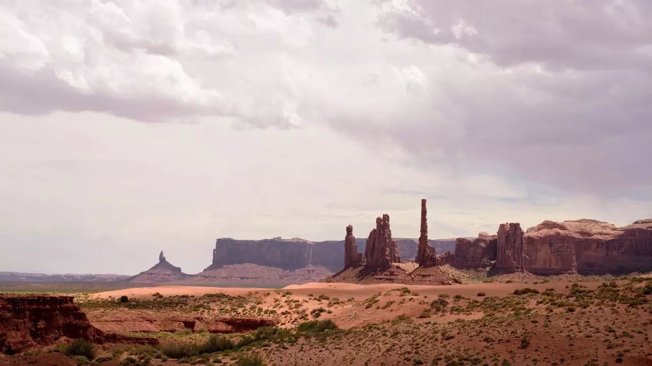 纪念碑谷里不仅石柱造型奇特,天气也十分奇怪,经常有白云夹杂乌云,半天阴雨,半天晴天。