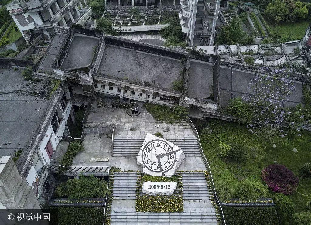 映秀漩口中学宿舍楼废墟,如今已长满青草和灌木。岷江在汶川群山间蜿蜒流淌,远处可见皑皑雪山,许多地震留下的痕迹已被植被悄悄覆盖。地震后形成的唐家山堰塞湖,彻底淹没了北川县漩坪乡,直到近几年水位退去,才露出一些建筑的屋顶。
