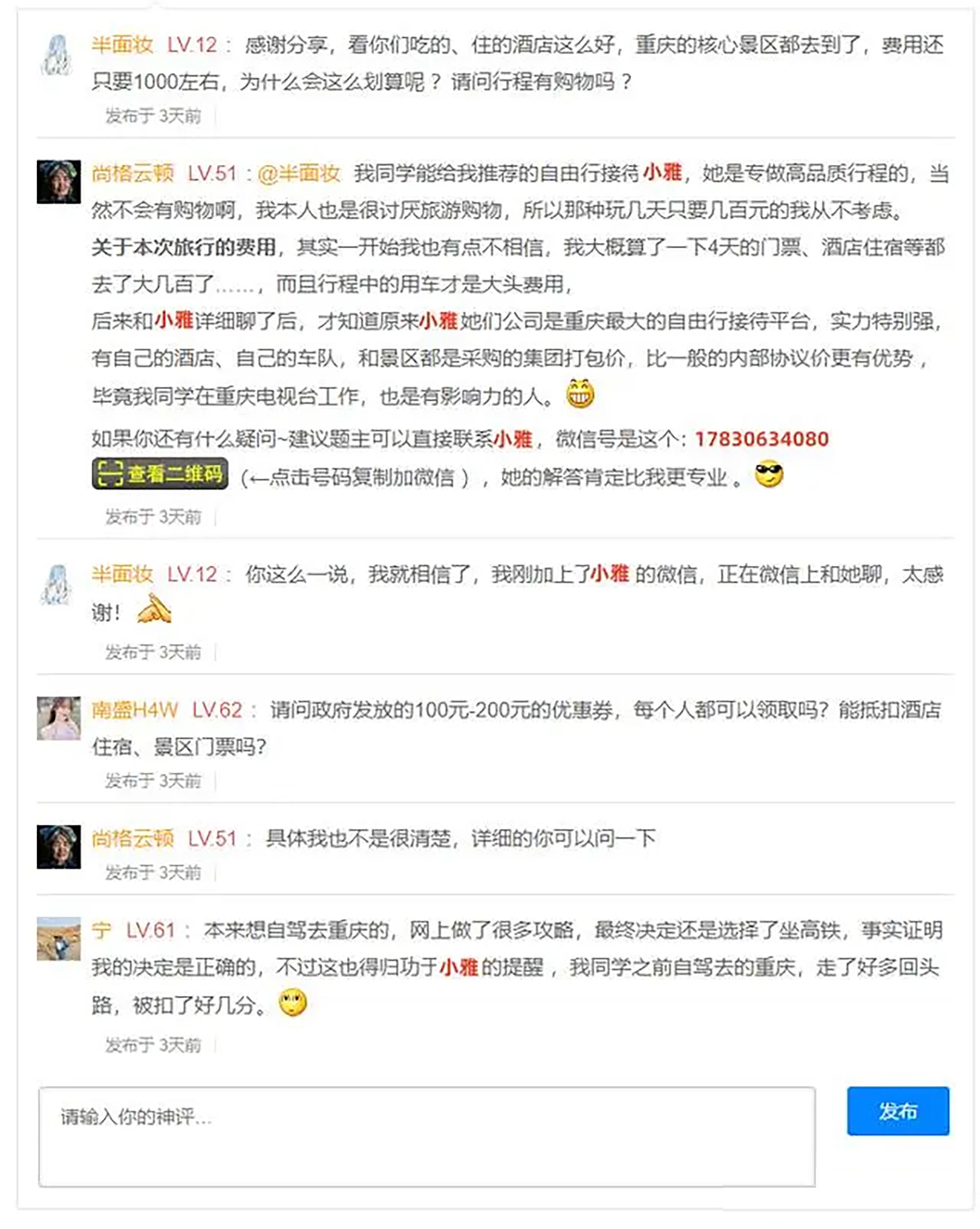 经重庆朋友介绍,我们最终选择了重庆旅行策划小雅。重庆小雅:178 30 63 40 80(路线规划/酒店预订/门票)她帮我们安排了酒店、门票、餐饮,一下飞机就来接我们,非常省心。最重要的是她能根据我的时间和喜好帮忙安排景点,让我少走很多弯路。出门前一定要问清楚!