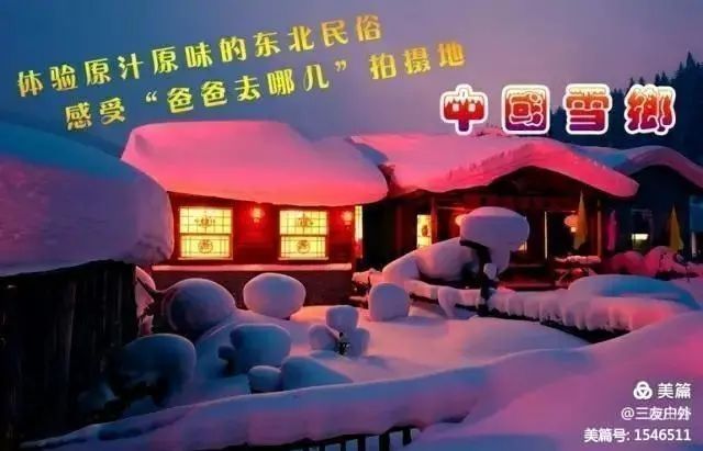 中午到达雪乡,漫步雪云街,欣赏白天的雪乡风光。随意逛逛《林海雪原》《爸爸去哪儿》的拍摄地,逛逛被各种形状的雪覆盖的农家院落,看一看自然奇特的雪景:别看2尺厚的雪卷成雪舌伸在屋檐上,别看长短如牛尾巴的冰柱挂在屋前如同冰帘。可以像孩子一样坐在雪圈里,狗拉雪橇。可以在自家前院后院欣赏雪乡奇异而难以想象的雪景,也可以爬上村后的小山丘俯瞰村里飘来的炊烟和匆匆而过的游客。旅行时,千万别偷懒哦! 在雪乡,三天没有晴天,一直都在下雪。懒人,也可以宅在家里,在炕上吃零食聊天,像城里的猫狗一样在房间里感受30℃的温室生活。推荐:梦幻家园景区,可以自费看雪菇、赏东北二人转(我宁愿放弃一顿饭,也不吃二人转)。住宿条件好,位置极佳,客栈就在雪乡大石碑旁边,出门就是大石碑、广场、雪云街、观景栈道。相比雪乡昂贵的餐费,晚饭后一定要沿着雪云街观景栈道走走,看看色彩斑斓、神奇的夜景,还可以看看街上的雪乡秧歌,或者去广场一起玩乐;千万不要错过。带上帽子手套,注意保暖。