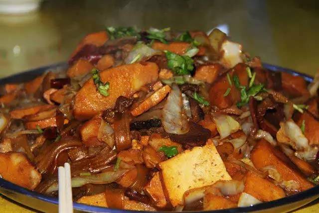 土豆沙茶是将土豆磨成一寸长的薄片,加入面粉,放入蒸锅蒸熟,食用时搭配当季野菜、洋槐花,再用葱油和辣面炒熟而成,口感爽滑,风味独特,是消食解腻的上佳之选。