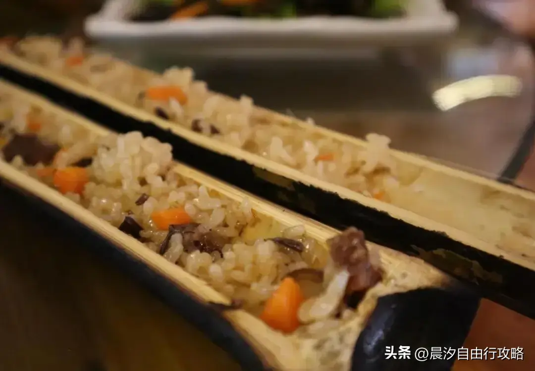 昌江李家竹筒饭,用新鲜竹筒装上调味炒熟的米,竹节青翠,米粒金黄,软糯可口。吃的时候,喝一口李家的“山兰酒”,满口都是李家的味道。