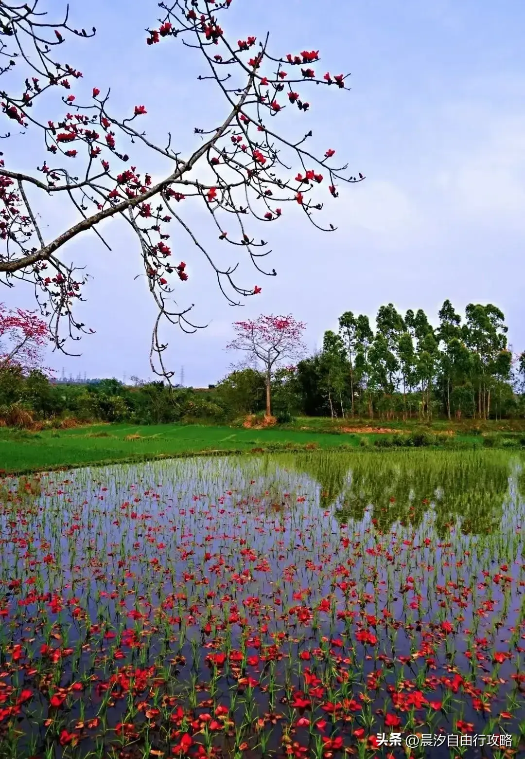 排安村的田野里,绵延1.6公里的木棉林掩映在绿油油的稻田旁,鲜红的木棉花在枝头盛开,争奇斗艳,可以打卡木棉+稻田的自然美景。