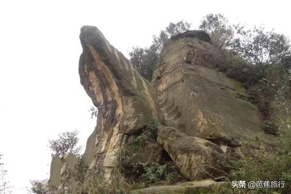 山前有一块巨石,与题字“虎峰马迹”高度相近,形似鸡冠,故名“鸡冠石”。站在鸡冠石上,可以俯瞰整个璧山区和沙坪坝大学城,十分壮观。但这里并不是最高处,要往上爬3米左右才能到达山顶。但因为山崖太陡,又没有受力点,徒手攀爬太危险了。笔者最终没能登上山顶,给这次户外旅行留下了些许遗憾。