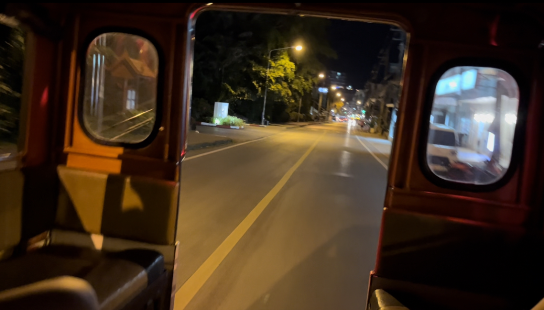 三轮嘟嘟车:街上随处可见,叫车方便,上车前要讲好价格。相对来说价格不算便宜,但值得体验(有些会放很hi的音乐,载着乘客在街上转悠)。从车上往外看是这样的: