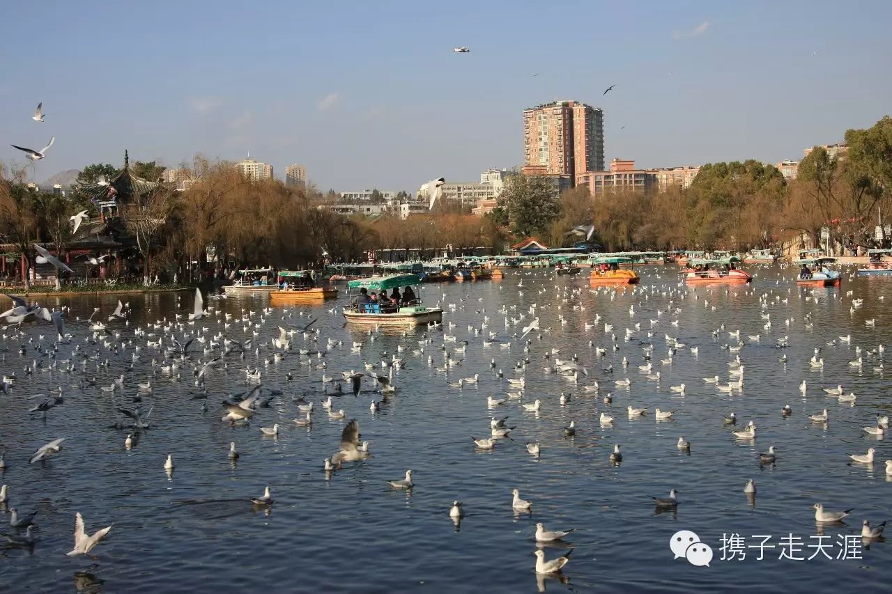 翠湖公园:每年10月中旬,来自西伯利亚的红嘴鸥飞到昆明过冬,次年3月飞走,主要栖息在翠湖公园和海埂公园。门票:免费