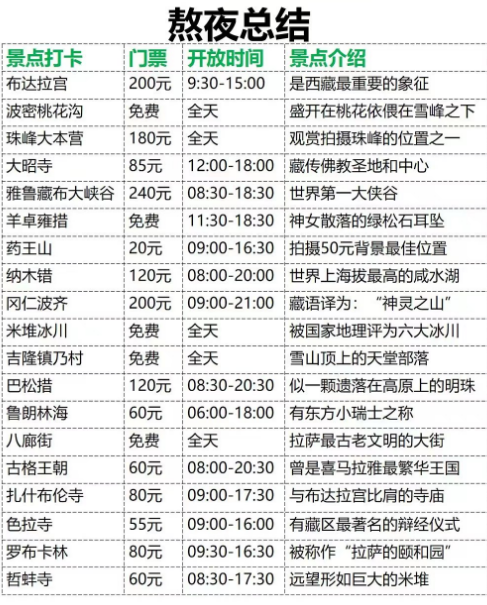 主要景点:羊湖(日多寺)、珠峰(珠峰大本营)、卡若拉冰川、纳木措等为观景点,可以下车观赏一两分钟。