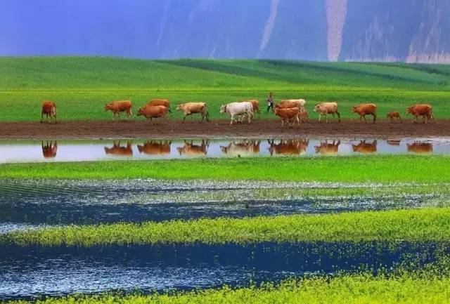 绿草与群山交汇之处,牛羊、白鹭伴着人们游览。