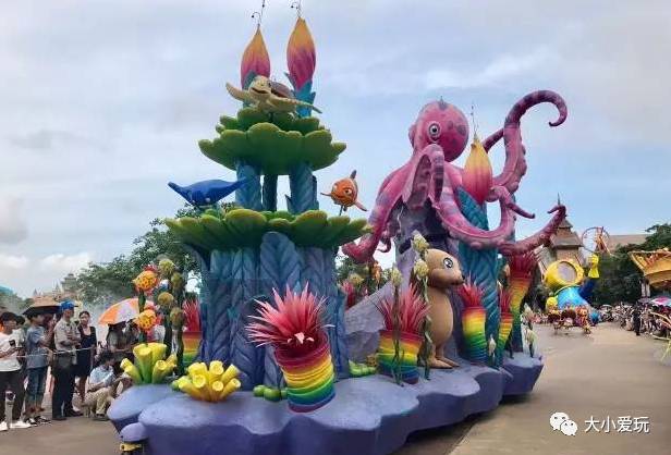 堪称世界级的大型花车秀,包括园内各种海洋动物主题的花车,演员阵容强大,充分展现了海洋王国的多彩活力,还有大家喜爱的海洋王国家族吉祥物陪伴在花车旁。可惜暖宝似乎注定只能坐迪士尼的花车,在睡梦中错过了长州恐龙园和这里的花车巡游。
