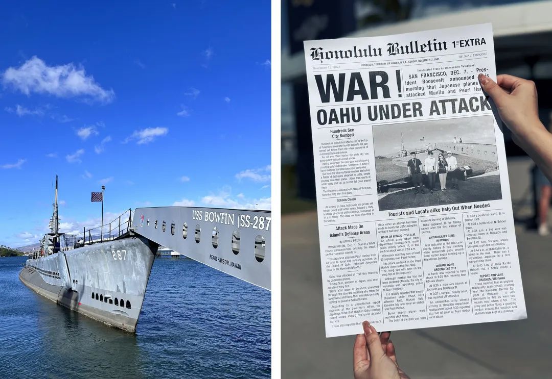 第二,在Bowfin潜艇的入口处会有人帮你拍照。参观完后会生成一张旧报纸(20美金),如果人多的话,留作纪念也挺好玩的。有免费的中文语音导游,可以一边听一边参观潜艇内部。参观完会发现潜艇里的士兵应该不高,从床铺的大小和空间就能感受到。