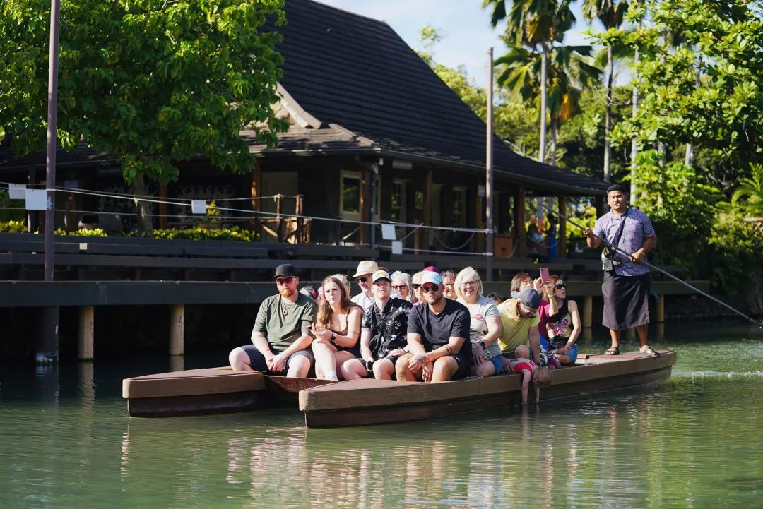 进园后的游览也比较简单,先坐游船,在导游的带领下一边听波利尼西亚文化的讲解,一边学习不同族群、地区的方言,最后到达目的地。园内还有很多互动项目,比如纹身、品尝不同地区的美食,甚至还可以参加汤加地区的舞台表演。晚上演艺中心还有精彩的文化表演。