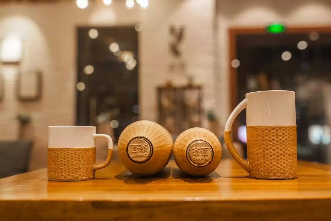 就连茶具也以竹壶、竹杯为特色,如今常见的骨瓷杯或保温壶,以细如发丝的竹丝缠绕,巧妙编织成能蓄水、能保温茶水的形状,既复古又时尚。