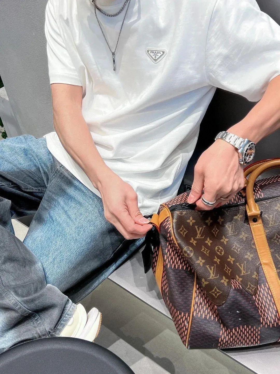 这身穿搭比较街头风,他用了一个非常大的monogram包包帮他打造了这身造型。白色短袖衬衫、牛仔裤和小白鞋是我们都很认可的三套基本款。每件单品都经过了时间的考验,非常经典。