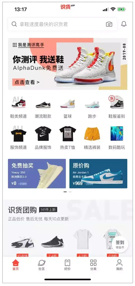 虎扑旗下的购物平台,与度、Nice不同,食货更像是一个中介,入驻商家和平台较多,用户点击购买后,页面会自动跳转到商家的淘宝店或平台小程序。食货主要有两大功能: